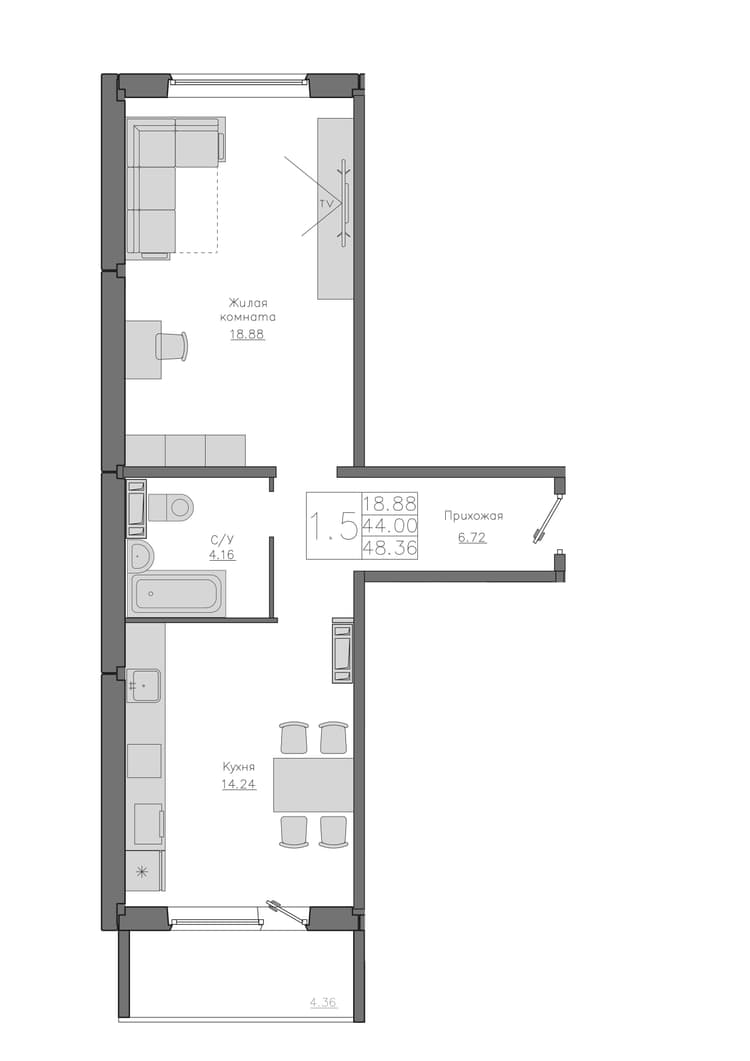 Квартира 45.16 м², 1 этаж