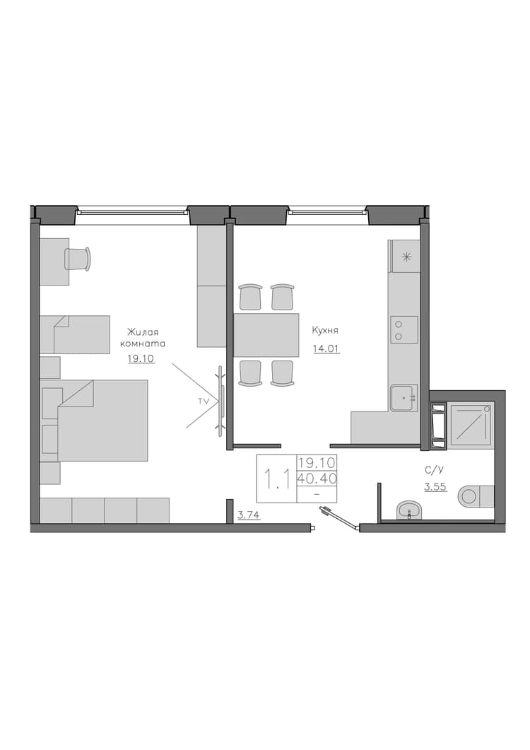 Квартира 40.4 м², 1 этаж