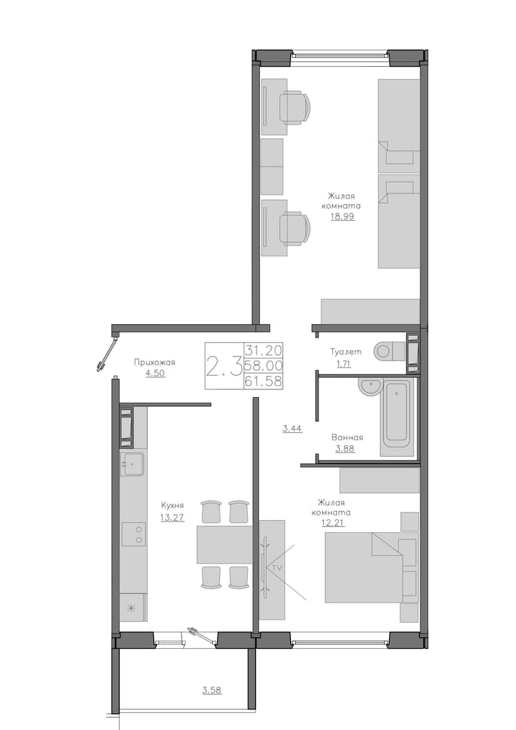 Квартира 58 м², 6 этаж