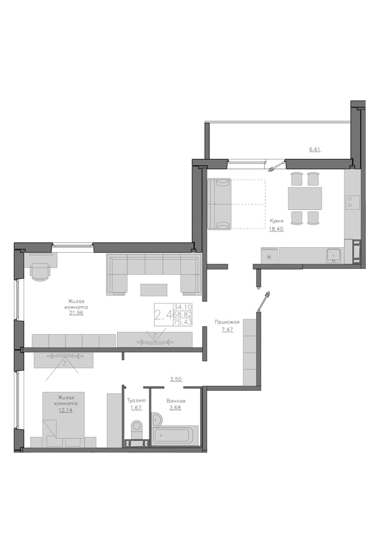 Квартира 68.82 м², 6 этаж