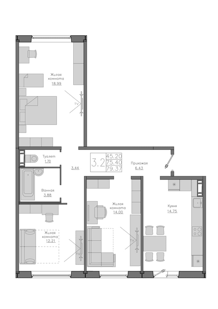 Квартира 75.4 м², 3 этаж
