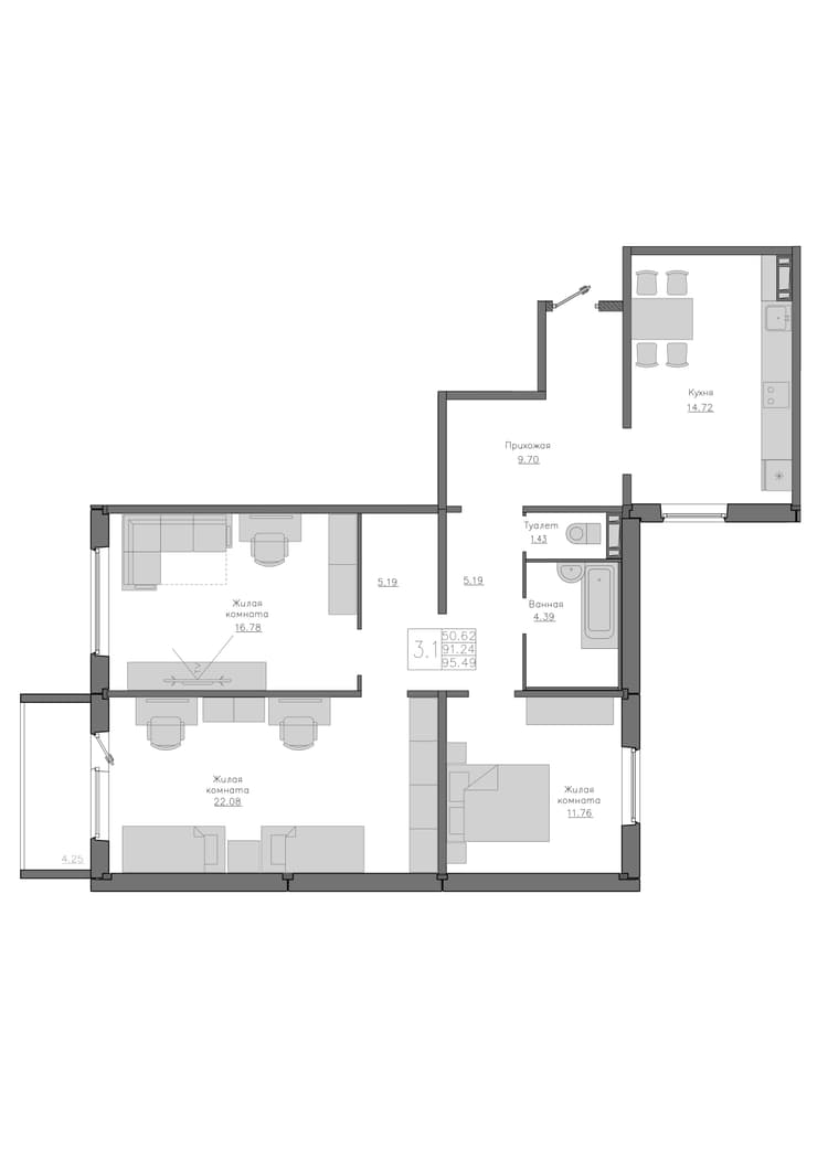 Квартира 91.24 м², 9 этаж